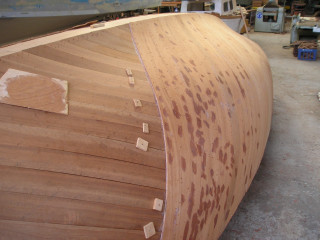 Please find also enclosed a couple of photos from the building of my wooden Romilly. In deviation from Ed Burnett’s original specification she is not build strip planked, but as a cold molded hull: Three layers of mahogany veneers are glued over a building jig using epoxy resin. The result is hoped to be a stiff, beautiful and easy to maintain hull.