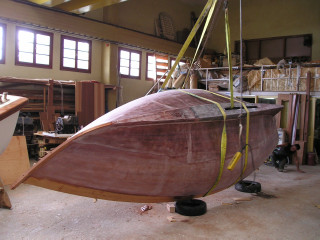 As further modification she will have a inboard diesel engine and, as most of the wooden Romilly’s have, a slightly elongated cabin. The plan is to finish her with a varnished hull and a teak deck.The boat is currently being build by a boatyard in Greece near Volos. Recently the hull was turned over. Work an the interior has just started.
